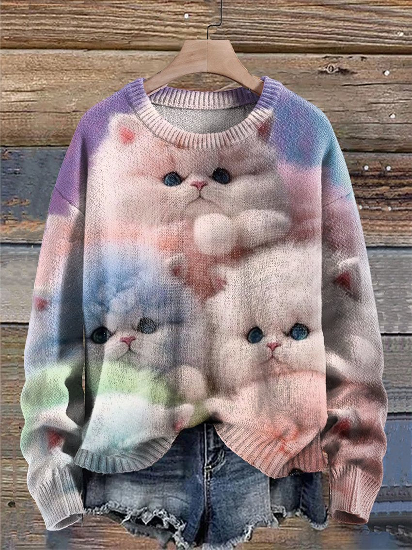 Macron Color Furry Cat Art Print Knit Pullover Sweater