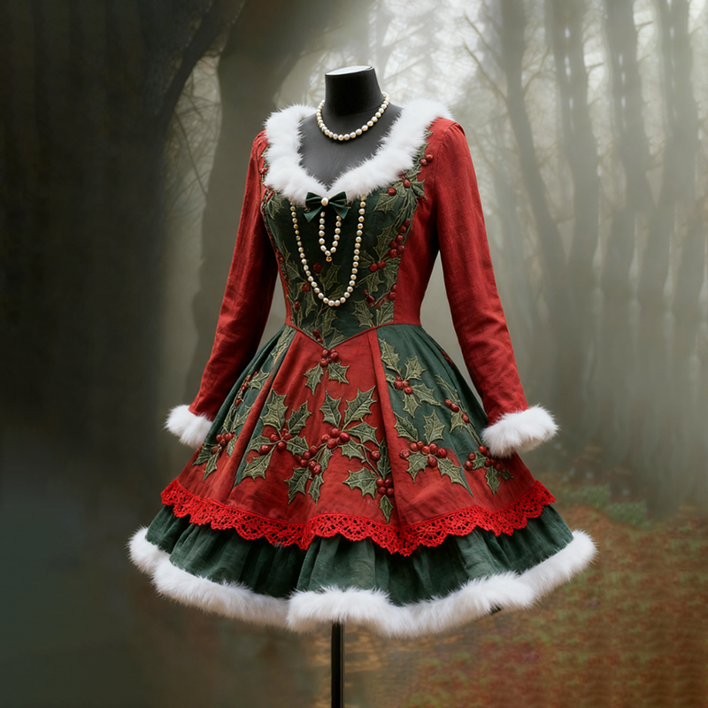 Women's Christmas Berry Print Fur Collar Midi Dress