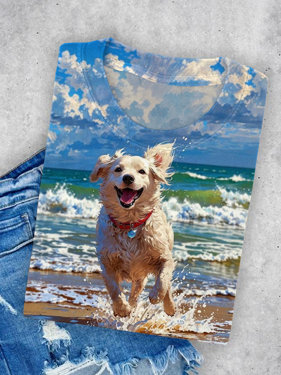 Women's Cute Dog Art Illustration Printed Casual Short Sleeve T-shirt